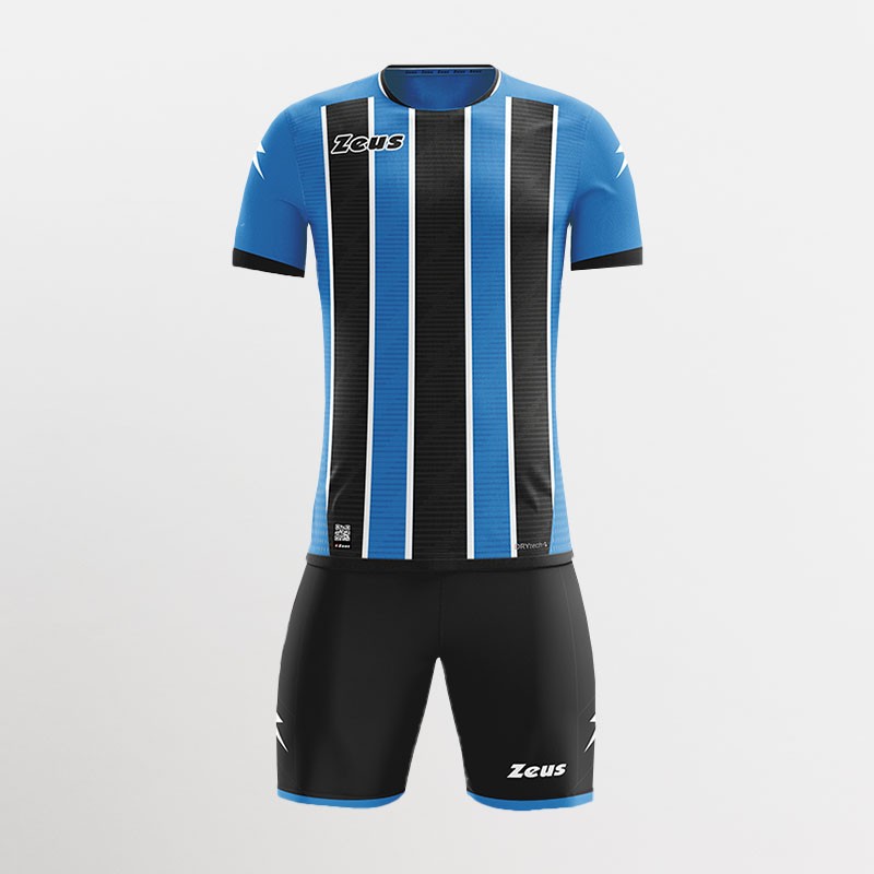 Kit calcio stampa sublimatica ispirato ai colori delle divise dei club di punta della serie A. Maglia manica corta + pantaloncino, con colletto a giro collo. Zeus lettering davanti e logo saetta sulle spalle della maglia e sui lati del pantaloncino. Svariate combinazioni di colori. Ideale per il gioco e gli allenamenti nel periodo primavera/estate. Personalizzabile con logo nome e numero