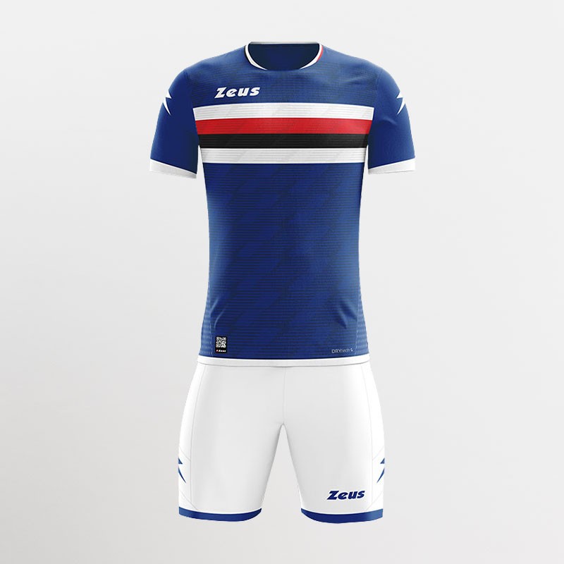 Kit calcio stampa sublimatica ispirato ai colori delle divise dei club di punta della serie A. Maglia manica corta + pantaloncino, con colletto a giro collo. Zeus lettering davanti e logo saetta sulle spalle della maglia e sui lati del pantaloncino. Svariate combinazioni di colori. Ideale per il gioco e gli allenamenti nel periodo primavera/estate. Personalizzabile con logo nome e numero